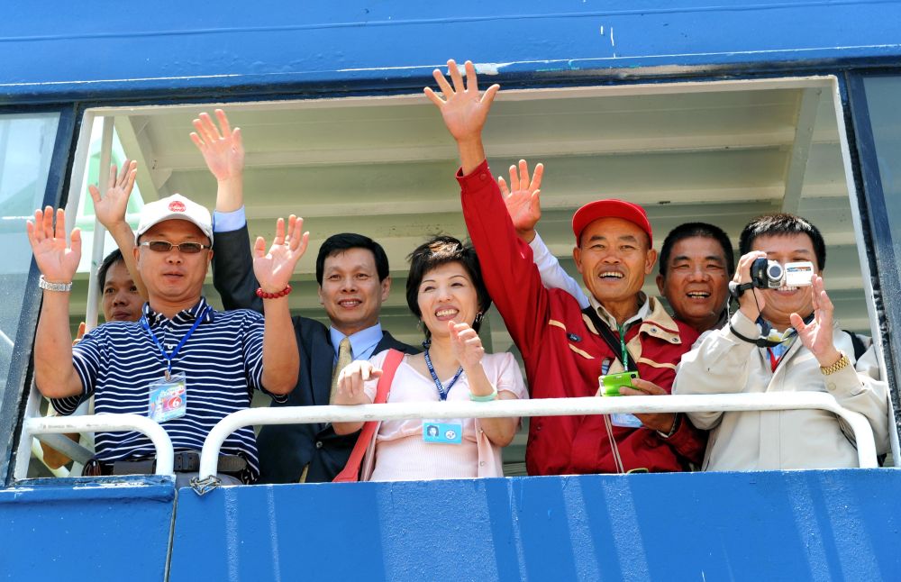 2009年5月15日,350名臺(tái)胞乘坐“海洋拉拉號(hào)”客輪從臺(tái)中港直航福建湄洲島謁祖進(jìn)香,拉開了首屆“海峽論壇”活動(dòng)的序幕。新華社記者 張國(guó)俊 攝