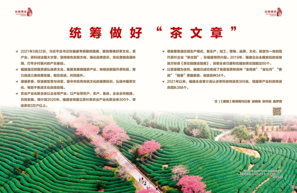 2021年3月22日,習(xí)近平總書(shū)記在福建考察期間強(qiáng)調(diào),要統(tǒng)籌做好茶文化、茶產(chǎn)業(yè)、茶科技這篇大文章,堅(jiān)持綠色發(fā)展方向,強(qiáng)化品牌意識(shí),優(yōu)化營(yíng)銷(xiāo)流通環(huán)境,打牢鄉(xiāng)村振興的產(chǎn)業(yè)基礎(chǔ)。