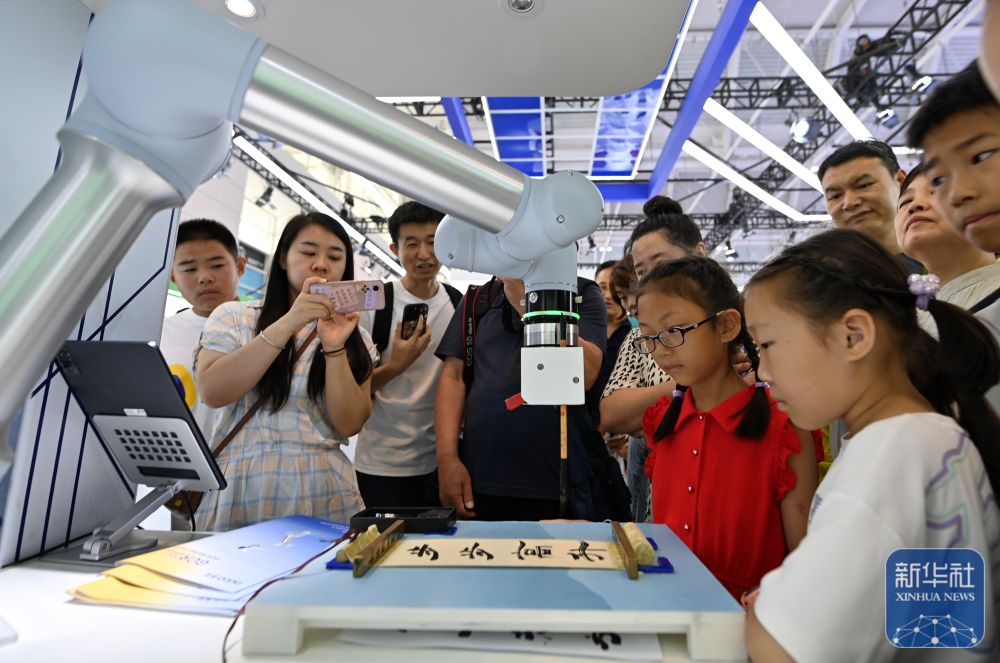6月22日,觀眾在博覽會上觀看機器人寫字。新華社記者 李然 攝