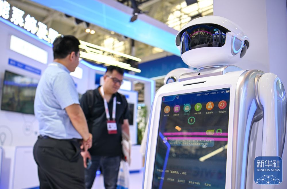 6月21日,與會者在博覽會現(xiàn)場咨詢了解一款適用于醫(yī)療場景的導(dǎo)診機器人。