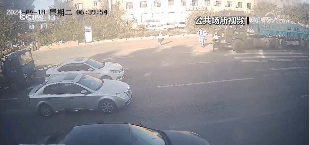視頻顯示,6月18日早上6點40分左右,輔警陳作兵在長春市第一O六中學校門前執(zhí)勤。突然,一輛大貨車從遠處駛來,不斷鳴笛。眼看就要經(jīng)過斑馬線卻沒有及時減速,此時學生和家長正要過馬路。陳作兵看到后,立即截停車輛,貨車剎車后由于慣性將他撞得連連后退。