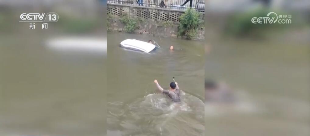 畫面中可以看到,這輛白色小車即將被河水沒過車頂。緊急關(guān)頭,三名熱心群眾先后跳下河涌,聯(lián)手營救被困司機。同時岸邊群眾也立即報警,請求救助。
