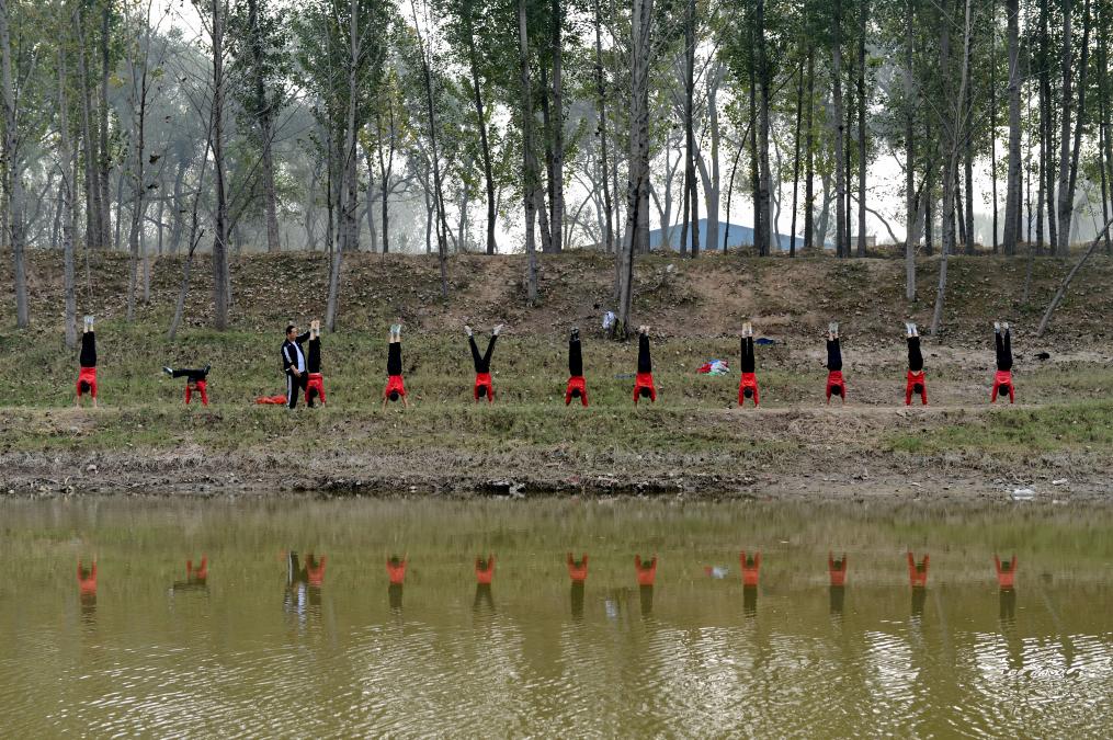 2014年10月24日,吳橋國際雜技藝術(shù)學(xué)校的學(xué)生們在大運(yùn)河邊練功。