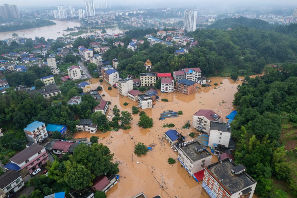 這是7月1日在平江縣天岳街道大西村拍攝的被淹現(xiàn)場(chǎng)(無(wú)人機(jī)照片)。新華社記者 陳思汗 攝