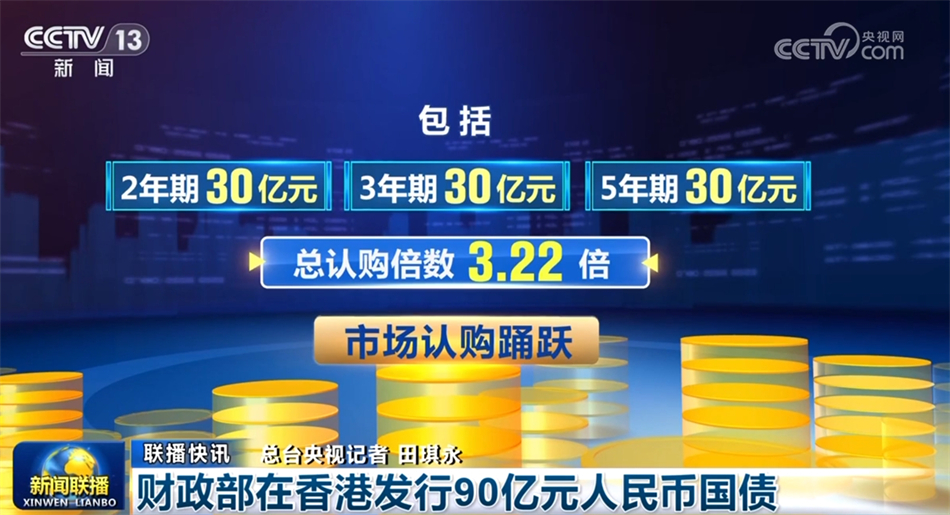財(cái)政部7月10日在香港招標(biāo)發(fā)行2024年第三期人民幣國債,發(fā)行規(guī)模為90億元,包括2年期、3年期、5年期各30億元??傉J(rèn)購倍數(shù)3.22倍,市場認(rèn)購踴躍。今年財(cái)政部在香港計(jì)劃發(fā)行550億元人民幣國債,進(jìn)一步完善常態(tài)化發(fā)行機(jī)制,支持鞏固提升香港國際金融中心地位。