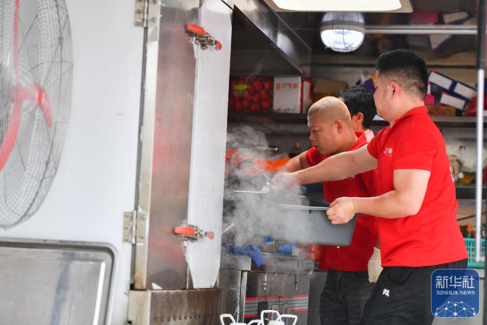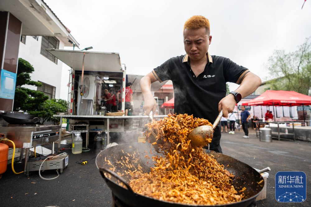 7月10日,在岳陽(yáng)市良心堡鎮(zhèn)望君洲村,志愿者在炒制菜肴。新華社記者 陳思汗 攝