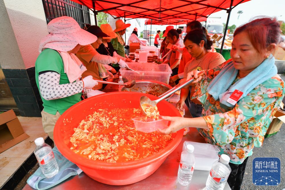 7月10日,在岳陽(yáng)市良心堡鎮(zhèn)望君洲村,志愿者在打包盒飯。新華社記者 陳思汗 攝
