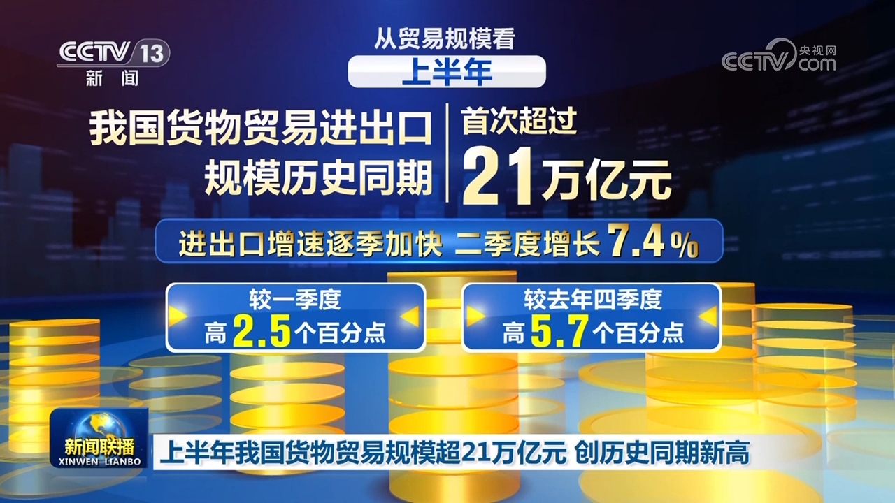 從貿(mào)易規(guī)模看,上半年,我國貨物貿(mào)易進出口規(guī)模歷史同期首次超過21萬億元。進出口增速逐季加快,二季度增長7.4%,較一季度和去年四季度分別高2.5個、5.7個百分點,貨物貿(mào)易進出口質(zhì)量持續(xù)提升、規(guī)模較快增長。