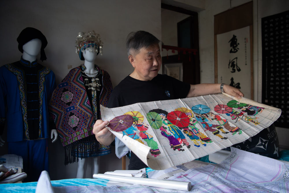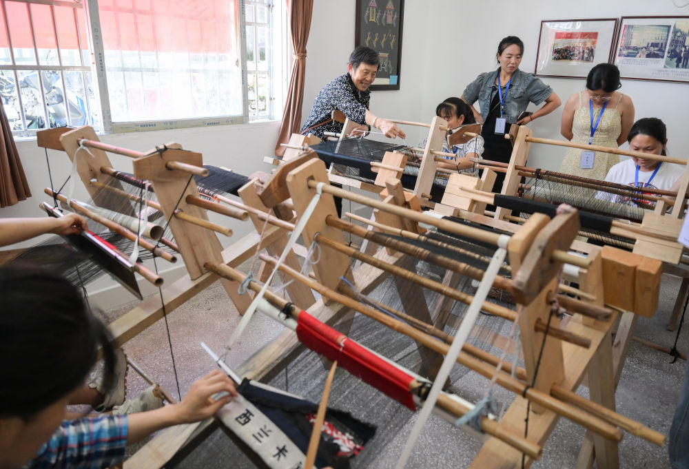 7月2日,唐洪祥的孫女唐鳴珂(后右一)在來鳳縣西蘭卡普培訓(xùn)班上展示西蘭卡普成品。今年29歲的唐鳴珂國外留學(xué)后回到家鄉(xiāng),從事西蘭卡普的傳承發(fā)展工作。
