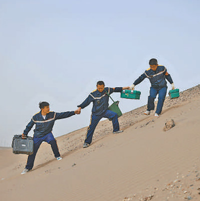 班組成員在翻越沙丘。 2014年,烏魯木齊西車輛段哈密動(dòng)態(tài)檢測(cè)車間哈羅班組正式成立,負(fù)責(zé)維護(hù)哈羅鐵路沿線設(shè)備。10年來(lái),哈羅班組堅(jiān)守在環(huán)境惡劣、條件艱苦的羅布泊,克服重重困難,做好鐵路巡檢和故障維修,保障鉀肥運(yùn)輸。 羅布泊,位于新疆東南部塔克拉瑪干沙漠邊緣,天上無(wú)飛鳥(niǎo),地上不長(zhǎng)草,只有漫無(wú)邊際的沙漠、戈壁、鹽堿灘。 這里一年中有200多天風(fēng)沙肆虐,夏季氣溫超過(guò)50攝氏度,冬季氣溫低至零下30攝氏度。這里是中國(guó)鐵路烏魯木齊局集團(tuán)有限公司烏魯木齊西車輛段哈密動(dòng)態(tài)檢測(cè)車間哈羅班組工作的地方。 是什么讓他們選擇到羅布泊工作?又是什么工作值得他們?cè)谶@里堅(jiān)守10年? “鐵路修到哪兒,人員就要配到哪兒” 嗚—— “火車進(jìn)站了,快!” 哈羅班組工長(zhǎng)臺(tái)欣龍和伙伴們沖向站臺(tái),幾個(gè)人一下子堵在了車門前。 “老吳,這回有啥?” “今兒有羊肉、雞蛋,還有一袋子番茄。” “嘿嘿嘿。” 車門旁,幾個(gè)大小伙兒咧著嘴憨笑。 臺(tái)欣龍工作的地方,叫羅中站,是哈羅鐵路的最后一站,地處羅布泊中心。這里雖通了電、通了水,但米、面、糧、油、飲用水等生活物資全靠火車從400公里外的哈密市送來(lái)。 “大小伙兒們,自己搬水?!绷熊囬L(zhǎng)老吳一聲令下,臺(tái)欣龍和伙伴們麻利地爬上車,一人扛下一桶15升的礦泉水。 “這兒的水堿性大,一燒開(kāi),全是白粒粒,沒(méi)法喝。”臺(tái)欣龍說(shuō),這15升礦泉水得撐一周。 在羅中站,差不多每隔5天會(huì)有通勤列車抵達(dá),送來(lái)各類物資。 列車停留5小時(shí),隨即返程。羅中站經(jīng)歷短暫的熱鬧后,再次回歸平靜。 除了人少、地荒、物資緊,寂寞、單調(diào)或許是在羅中站工作、生活面臨的最大困難。 這里沒(méi)有商店、沒(méi)有飯館、沒(méi)有影院。白天,手機(jī)還能有網(wǎng)絡(luò)信號(hào),晚上則幾乎沒(méi)有信號(hào)。乒乓球、象棋以及少量書籍,為臺(tái)欣龍和伙伴們提供了少有的娛樂(lè)方式。 2014年,中國(guó)鐵路烏魯木齊局集團(tuán)有限公司烏魯木齊西車輛段哈密動(dòng)態(tài)檢測(cè)車間哈羅班組正式成立,負(fù)責(zé)維護(hù)哈羅鐵路沿線設(shè)備。當(dāng)年,剛畢業(yè)的臺(tái)欣龍來(lái)到了這里。 當(dāng)時(shí)也沒(méi)想太多,覺(jué)得在哪里都是干活,就接受了單位安排?!拌F路修到哪兒,人員就要配到哪兒,這活總得有人干。”臺(tái)欣龍說(shuō)。 如今,哈羅班組共有7人,大伙兒隔10天輪一次班。班組里年齡最大的丁鵬今年51歲了,最小的永志帥和杜權(quán)也已31歲。 “假如某個(gè)檢測(cè)站發(fā)出故障警報(bào),無(wú)論什么天氣,都必須立即響應(yīng)” 凌晨3時(shí)20分,顛簸了近5個(gè)小時(shí),臺(tái)欣龍和兩名隊(duì)員到達(dá)了黑龍峰動(dòng)態(tài)設(shè)備檢測(cè)站。這里,距離羅中站230公里。 夜間出行,沒(méi)有道路、沒(méi)有路燈、沒(méi)有導(dǎo)航,臺(tái)欣龍駕駛著皮卡車朝著鐵路延伸的方向在茫茫戈壁灘里蹚出路。這一路大坑套小坑,人的腦袋時(shí)不時(shí)頂?shù)杰図?,撞得生疼?/p> 下了車,風(fēng)裹著沙子打在臉上、頭燈上,幾乎掩蓋了說(shuō)話聲。時(shí)間長(zhǎng)了,臺(tái)欣龍和隊(duì)友們便形成了默契,只需一個(gè)手勢(shì),便知道對(duì)方的意思。 4時(shí)10分,臺(tái)欣龍和隊(duì)友開(kāi)始作業(yè)。 打開(kāi)紅外線軸溫探測(cè)設(shè)備(THDS)的機(jī)蓋,映入眼簾的是一層厚厚的沙塵。臺(tái)欣龍熟練地拿出吹風(fēng)機(jī)、毛刷,仔細(xì)清理室外探頭箱里的沙塵,再把黑體(一種檢測(cè)設(shè)備)放置在探頭箱上,進(jìn)行溫度檢測(cè)校準(zhǔn)。 “我們這里夏季溫度高,若列車輪對(duì)軸溫超標(biāo),就有斷軸風(fēng)險(xiǎn),引發(fā)安全事故。檢測(cè)儀器必須保證準(zhǔn)確性?!迸_(tái)欣龍解釋,根據(jù)標(biāo)準(zhǔn),THDS低溫檢測(cè)誤差正負(fù)不得超過(guò)2攝氏度,高溫時(shí)段不得超過(guò)3攝氏度。“但我們自己的要求是將誤差控制在1攝氏度。” 早晨7時(shí),臺(tái)欣龍一行結(jié)束檢測(cè)任務(wù),踏上了回程路,直到中午12時(shí)才趕回駐地。 “今天這一路,算順利的。”臺(tái)欣龍說(shuō),“假如某個(gè)檢測(cè)站發(fā)出故障警報(bào),無(wú)論什么天氣,都必須立即響應(yīng)?!痹诹_布泊,沙塵暴說(shuō)來(lái)就來(lái),一刮就是三四個(gè)小時(shí)。有一回,他們遇上特大沙塵暴,風(fēng)暴像堵墻一樣迎面撲來(lái)。越野車迎風(fēng)的一側(cè),車漆幾乎全被風(fēng)沙打掉?!靶姨澑浇凶鶚蚝?,大伙兒在里頭躲了3個(gè)多小時(shí)?!憋L(fēng)暴過(guò)后,衣服上、頭發(fā)上、耳朵里、鼻孔里全都是沙子。一抬腳,鐵道路基上的風(fēng)沙已沒(méi)過(guò)膝蓋。 還有一次,冬季雪夜,臺(tái)欣龍和隊(duì)友們?nèi)ヌ幚砭o急故障。大雪的掩蓋,讓茫茫戈壁更難辨認(rèn)方向。“我們一不小心走錯(cuò)了方向,跑了很多冤枉路,最終汽車油料不足,只能請(qǐng)求救援,天亮了才出來(lái)。”臺(tái)欣龍說(shuō)。 “檢修得跟上,為鉀肥運(yùn)輸做好保障” 無(wú)水、無(wú)人、無(wú)城,哈羅鐵路為何要修往羅布泊? 原來(lái),羅布泊寸草不生的地表之