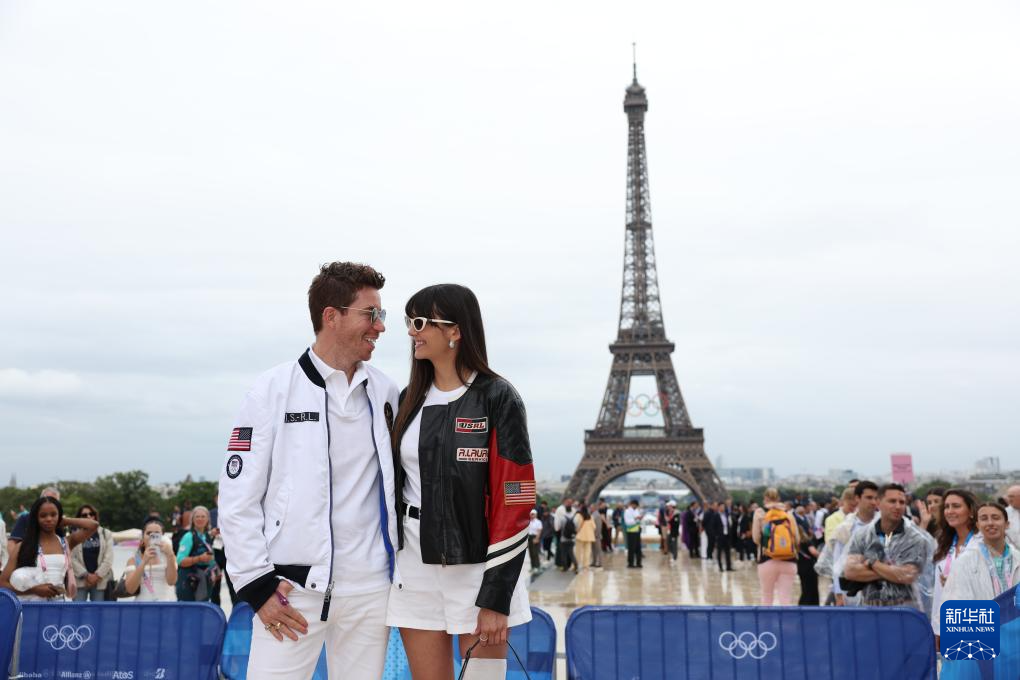 7月26日,中國體育代表團(tuán)旗手、乒乓球選手馬龍(左)與哥倫比亞體育代表團(tuán)成員在埃菲爾鐵塔前相互致意。新華社記者 李明 攝