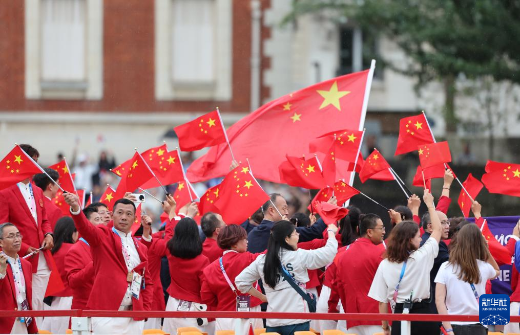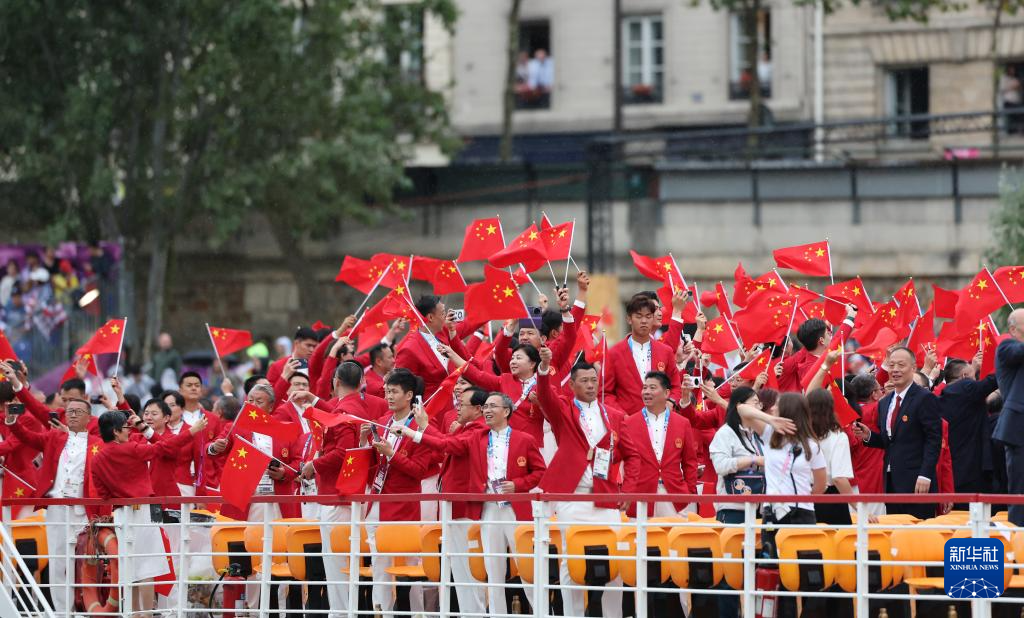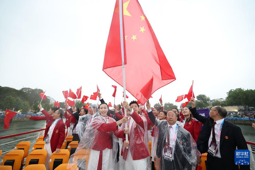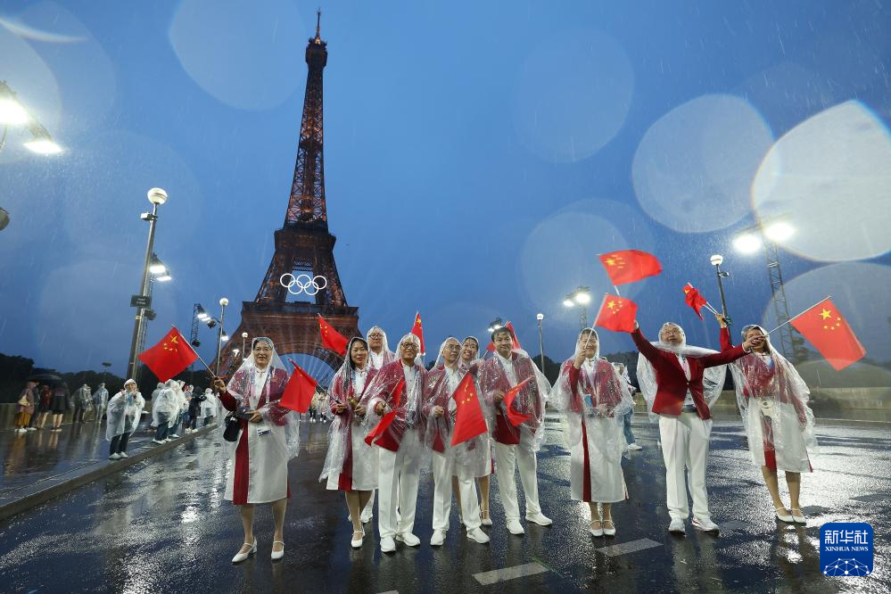 7月26日,中國體育代表團(tuán)成員在開幕式現(xiàn)場。新華社記者 王毓國 攝