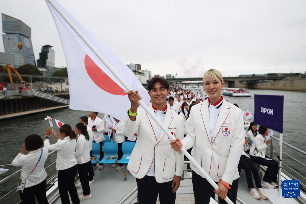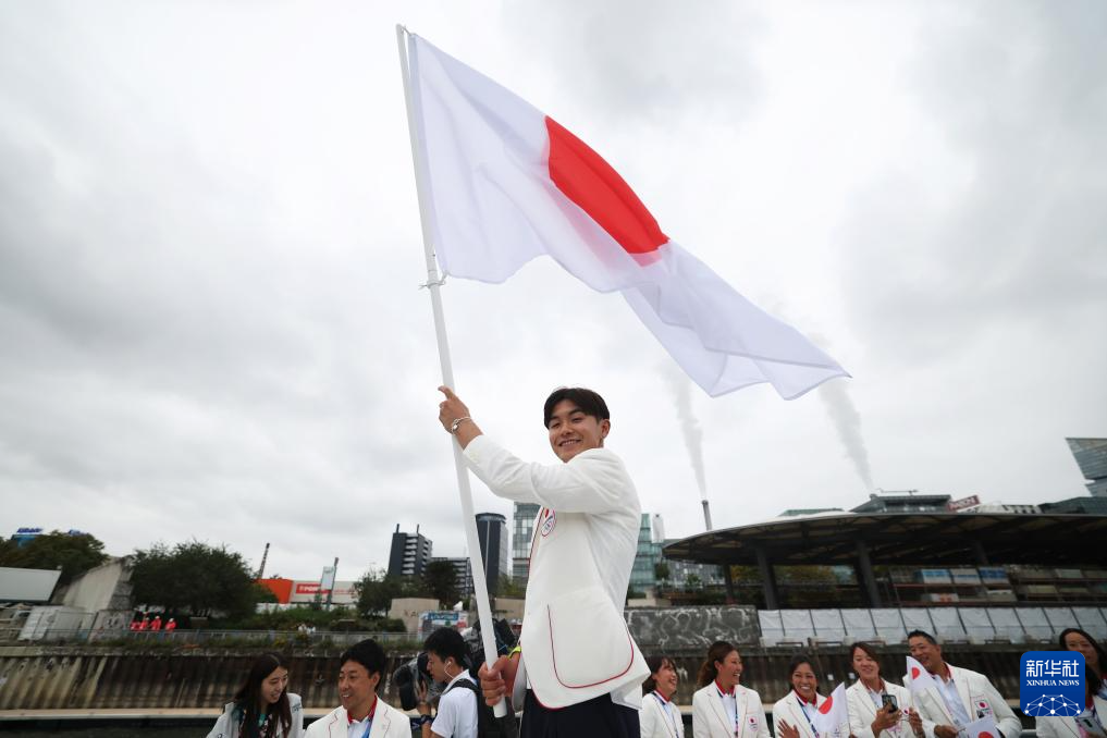 7月26日,日本體育代表團(tuán)旗手、霹靂舞運(yùn)動員半井重幸在開幕式上揮舞國旗。新華社發(fā)(POOL照片/邁克爾·里夫斯)pagebreak