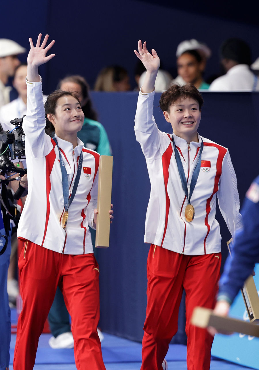 7月27日,中國(guó)選手昌雅妮(左)/陳藝文向觀眾揮手致意。新華社記者 張玉薇 攝