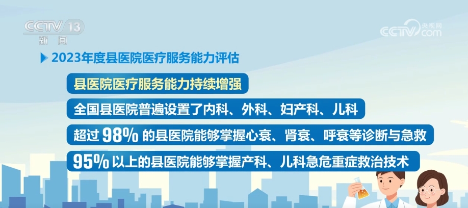 央視網(wǎng)消息:國(guó)家衛(wèi)生健康委29日通報(bào)了2023年度縣醫(yī)院醫(yī)療服務(wù)能力評(píng)估情況,全國(guó)共有2062家縣醫(yī)院參與醫(yī)療服務(wù)能力第三方評(píng)估,縣域覆蓋率達(dá)到98.6%。評(píng)估顯示,全國(guó)有91.85%的縣醫(yī)院符合基本標(biāo)準(zhǔn),也就是相當(dāng)于達(dá)到二級(jí)醫(yī)院能力,其中符合推薦標(biāo)準(zhǔn)達(dá)到三級(jí)醫(yī)院能力的占比超過一半。