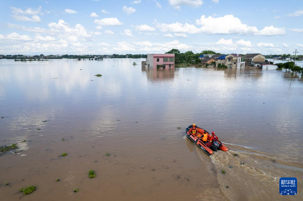7月29日,在涓水湘潭縣河口鎮(zhèn)華中村堤段附近,搶險人員搜尋被困群眾(無人機照片)。新華社記者 陳思汗 攝