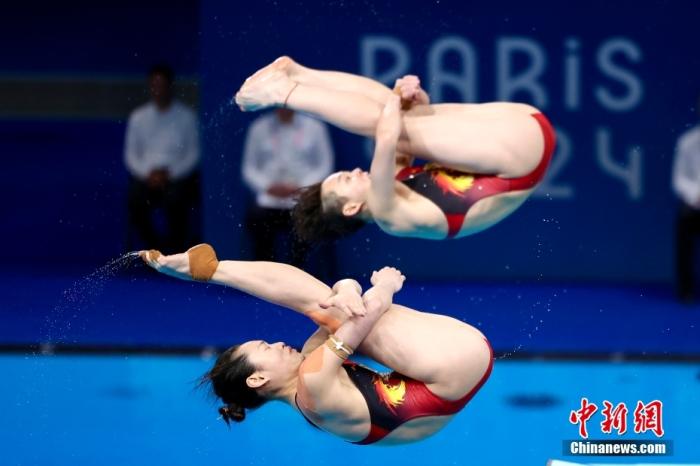 當(dāng)?shù)貢r間7月27日,中國組合昌雅妮(下)/陳藝文在比賽中。當(dāng)日,在巴黎奧運會跳水女子雙人3米板決賽中,中國組合昌雅妮/陳藝文奪得金牌。 中新社記者 富田 攝