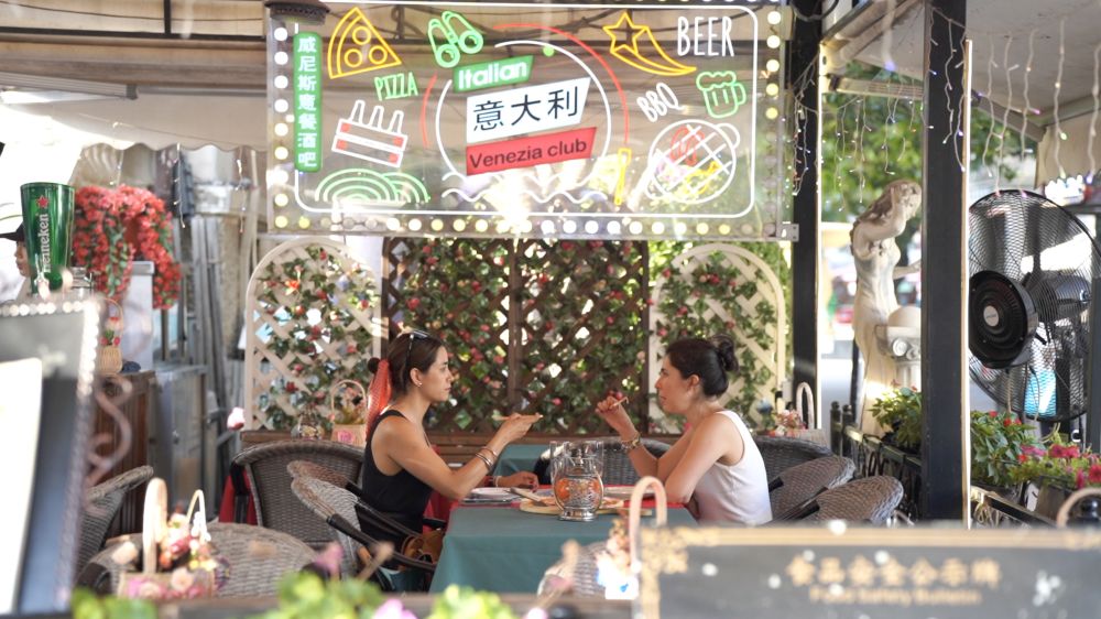 意式風(fēng)情區(qū)核心區(qū)是由五經(jīng)路、博愛(ài)道、勝利路、建國(guó)道合圍而成的四方形地區(qū)。走進(jìn)這一片街區(qū),不經(jīng)意間有種穿越到意大利的錯(cuò)覺(jué)。近期,意式風(fēng)情區(qū)的“洋面孔”也多了起來(lái)。他們有的閑坐戶外,品嘗風(fēng)味獨(dú)到的美酒佳肴;有的進(jìn)行“特種兵式”拍照打卡,記錄這場(chǎng)獨(dú)特的中國(guó)之旅……