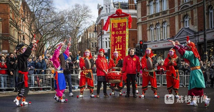 當?shù)貢r間 2024 年 2 月 11 日,陳來發(fā)教練率領廣東普寧南山英歌隊的近 20 名舞者現(xiàn)身英國倫敦,揭開了當?shù)匦麓簯c典的帷幕,這也是普寧英歌首次出海。與此同時,千里之外的普寧市內(nèi)另有一支南山英歌隊伍正穿梭于街巷,為市民驅(qū)邪扶正,帶隊者之一正是陳揚波。
