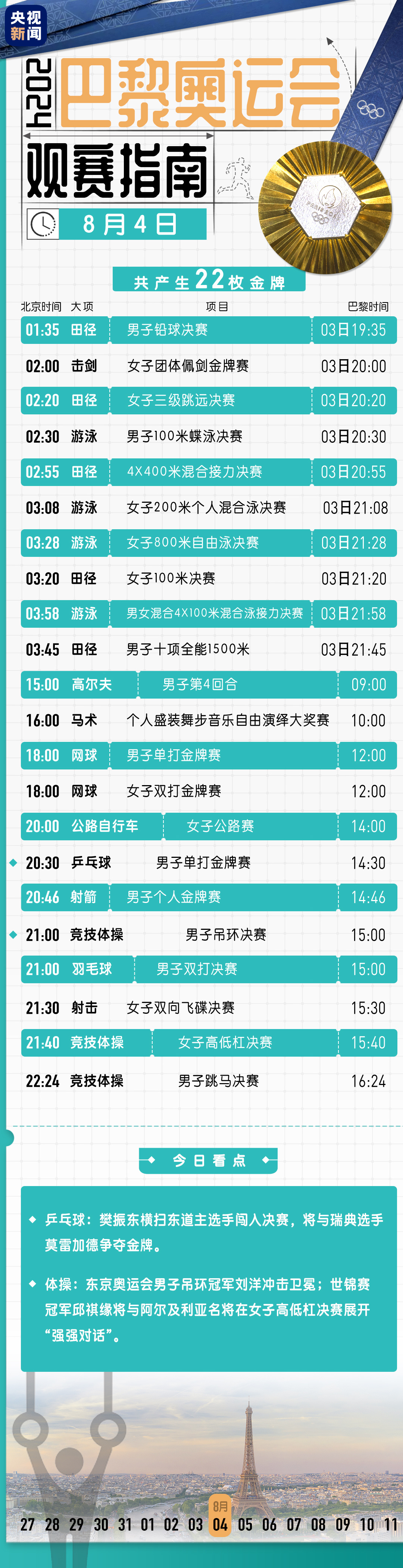 巴黎奧運會第九個比賽日將產(chǎn)生20枚金牌。中國體育代表團將在乒乓球、羽毛球等項目上沖擊金牌。