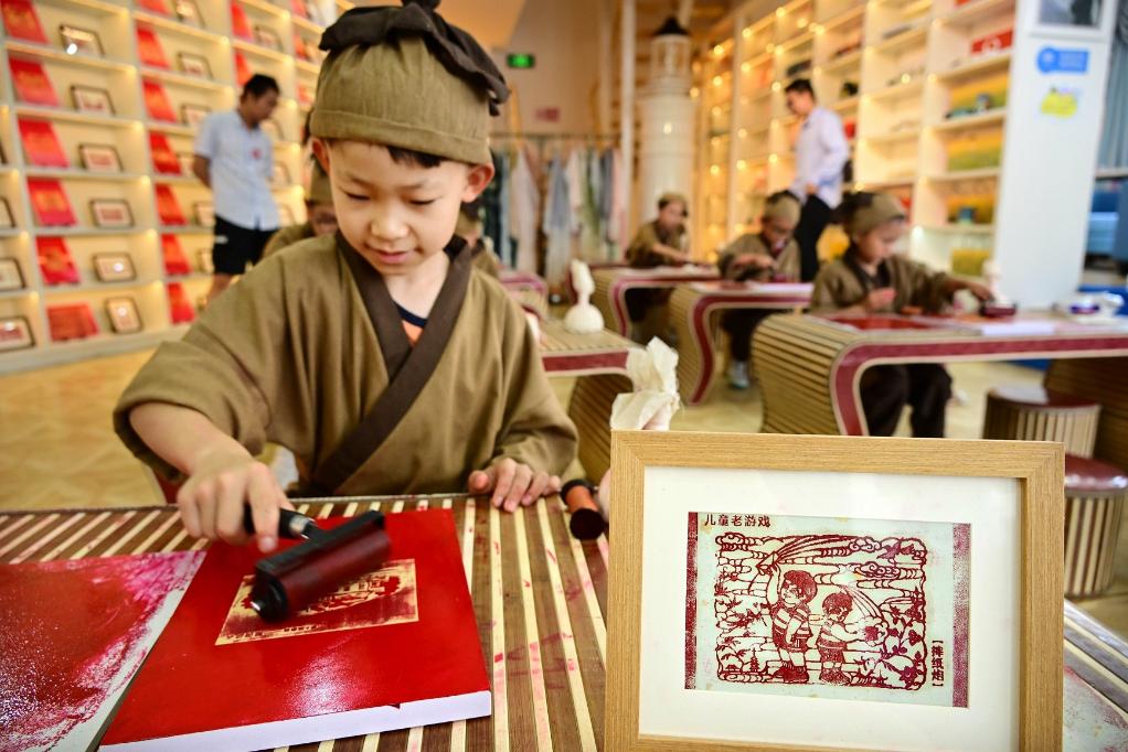 暑假期間,位于青島棧橋書店的印象國風(fēng)藝術(shù)館舉行拓印研學(xué)活動(dòng),吸引學(xué)生前來學(xué)習(xí)、體驗(yàn)。新華社記者 李紫恒 攝