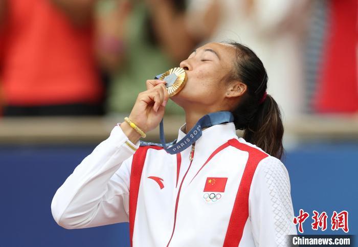 當(dāng)?shù)貢r(shí)間8月3日,在巴黎奧運(yùn)會(huì)網(wǎng)球女子單打比賽中,中國(guó)選手鄭欽文以2:0勝克羅地亞選手維基奇,獲得金牌。圖為鄭欽文親吻金牌。中新社記者富田攝