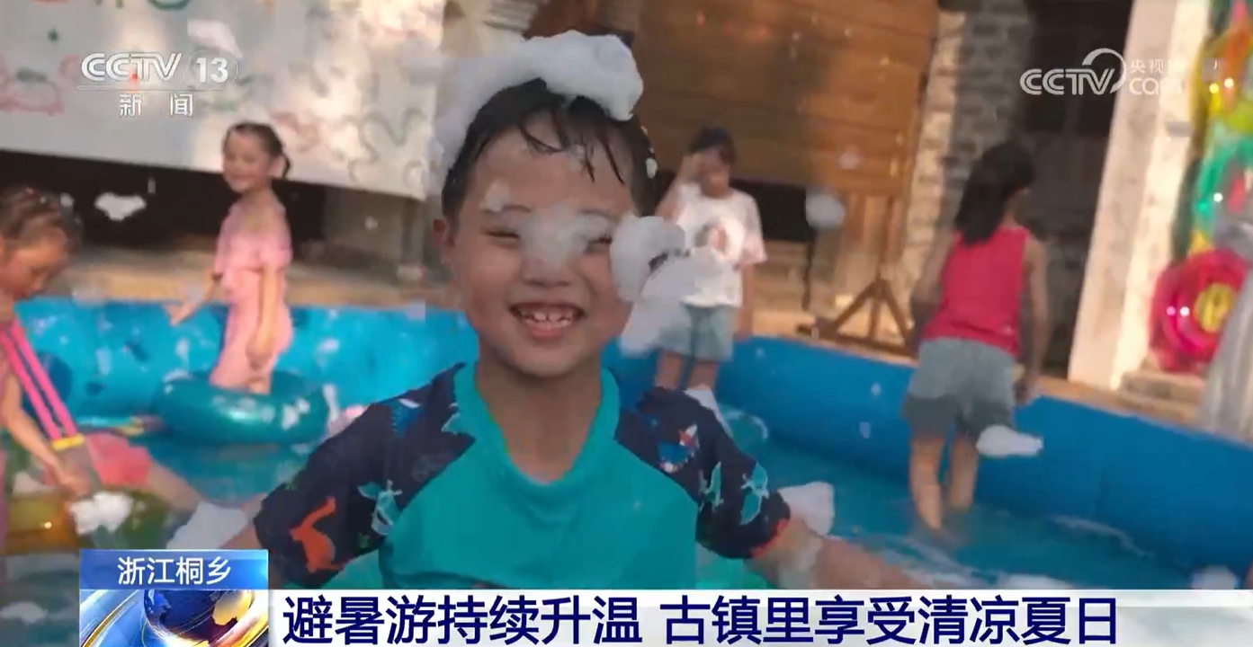 在古鎮(zhèn)景區(qū)的充氣泳池內,小朋友們游泳、打水仗,時不時還上演一場泡泡大戰(zhàn),水槍射擊戰(zhàn)、水球打靶等親水項目,讓孩子們盡享戲水的清涼時光。