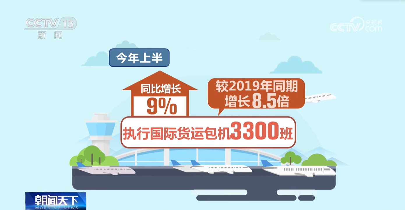 為適應(yīng)跨境電商、電動汽車、鋰電池和光伏產(chǎn)品“新三樣”等貨物運(yùn)輸?shù)臅r(shí)效性、靈活性要求,國際貨運(yùn)不定期航班量也保持增長的趨勢。今年上半年執(zhí)行國際貨運(yùn)包機(jī)3300班,同比增長9%,較2019年同期增長8.5倍。