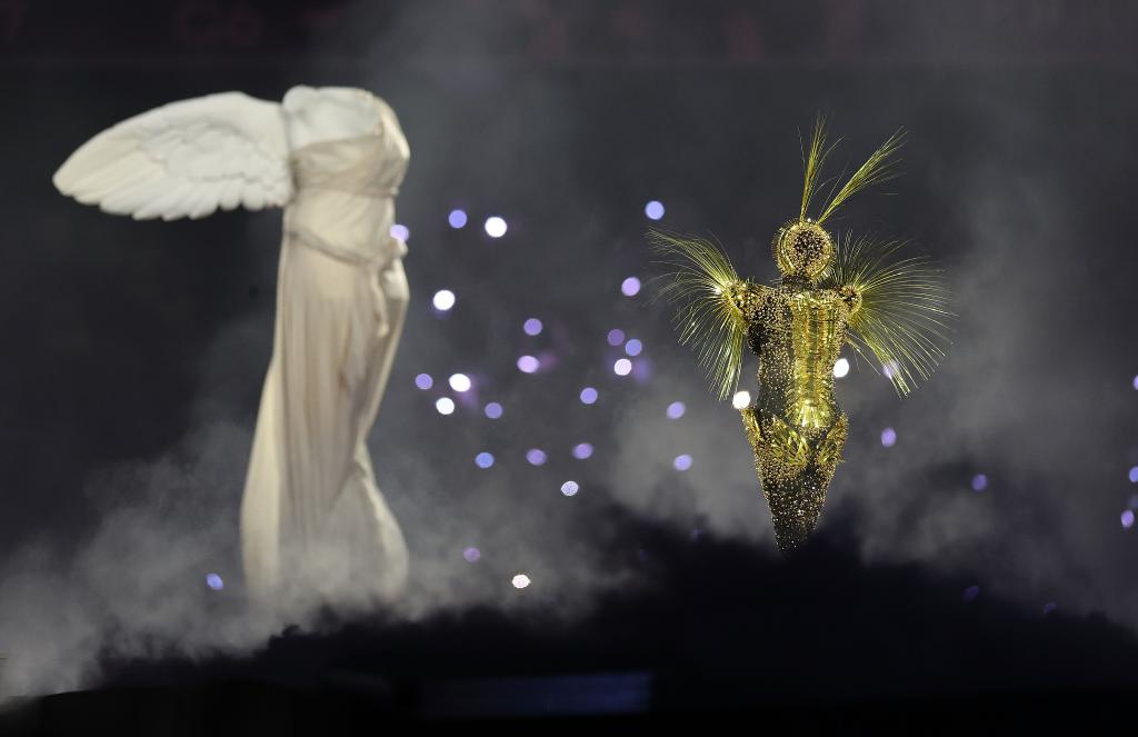 夜幕降臨,法蘭西體育場進入另一個時空——一個奧運會消失的世界。金色旅行者從天而降,隨著他的腳步,人們踏上一場夢幻般的探索。希臘國旗、奧運五環(huán)……與奧林匹克相關的遺跡逐漸被發(fā)掘。