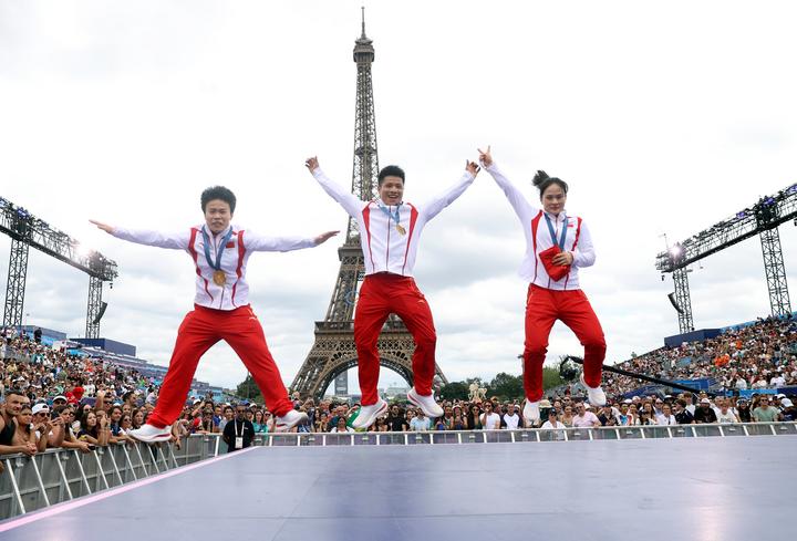 8月9日,中國舉重選手侯志慧(左)、李發(fā)彬(中)和羅詩芳在冠軍公園慶祝。當日,觀眾來到位于法國巴黎特羅卡德羅廣場的冠軍公園,與奧運獎牌獲得者分享榮耀。新華社記者 雒圓 攝