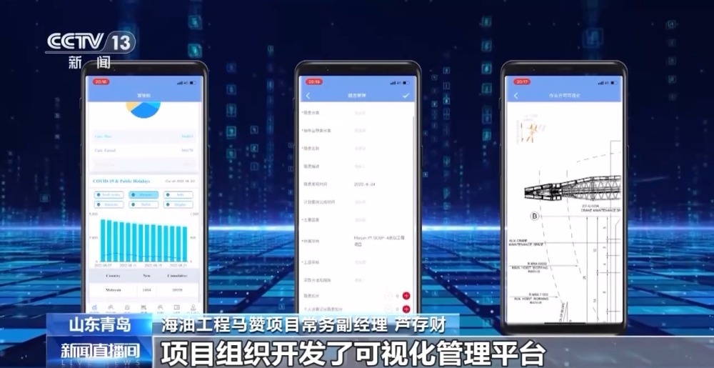 海油工程馬贊項目常務(wù)副經(jīng)理 蘆存財:對一個總重近2萬噸的超級組塊,平臺材料、設(shè)備成千上萬,項目組織開發(fā)了可視化管理平臺,通過數(shù)字模擬、建造孿生技術(shù)實現(xiàn)建造全流程的數(shù)字化管控。