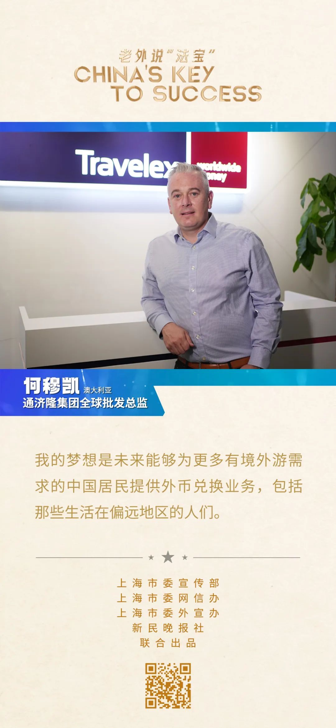 何穆凱所在的通濟隆集團是一家以從事貨幣金融服務(wù)為主的企業(yè)。這些年,中國出境游市場蓬勃發(fā)展,讓這家公司在中國市場取得了巨大成功。“我的夢想是未來能夠為更多有境外游需求的中國居民提供外幣兌換業(yè)務(wù),包括那些生活在偏遠地區(qū)的人們?!?/strong>