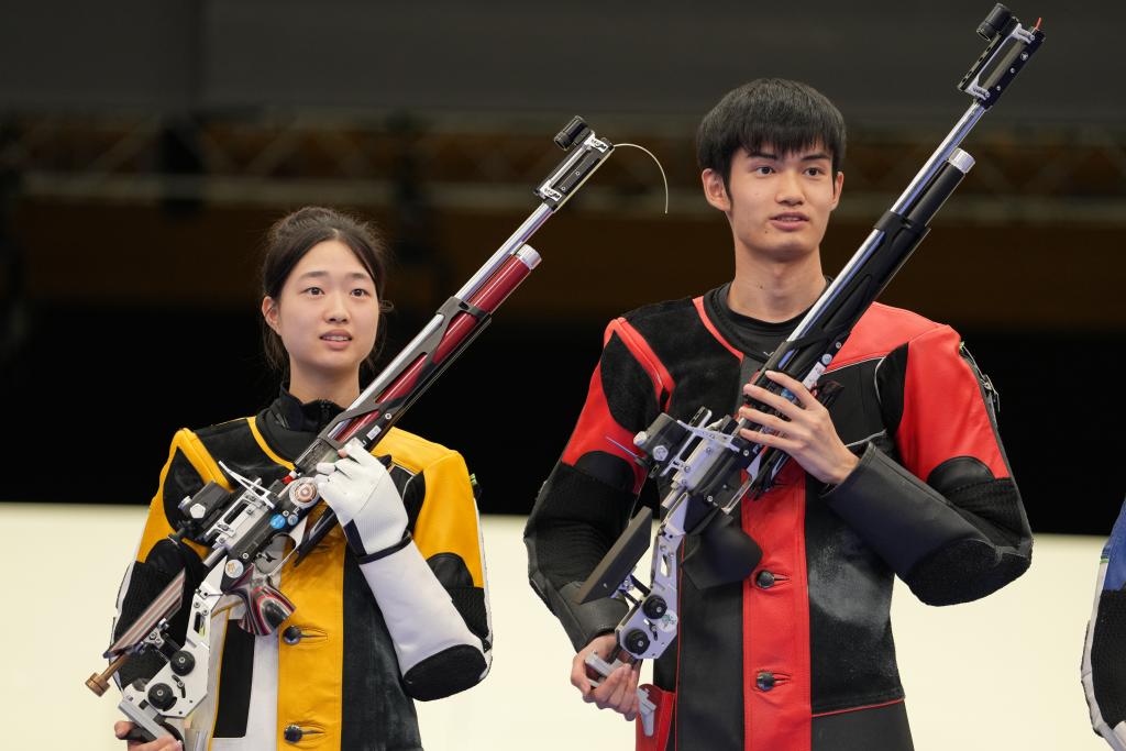 7月27日,中國選手黃雨婷/盛李豪(右)在贏得巴黎奧運(yùn)會(huì)首枚金牌后。新華社記者 鞠煥宗 攝