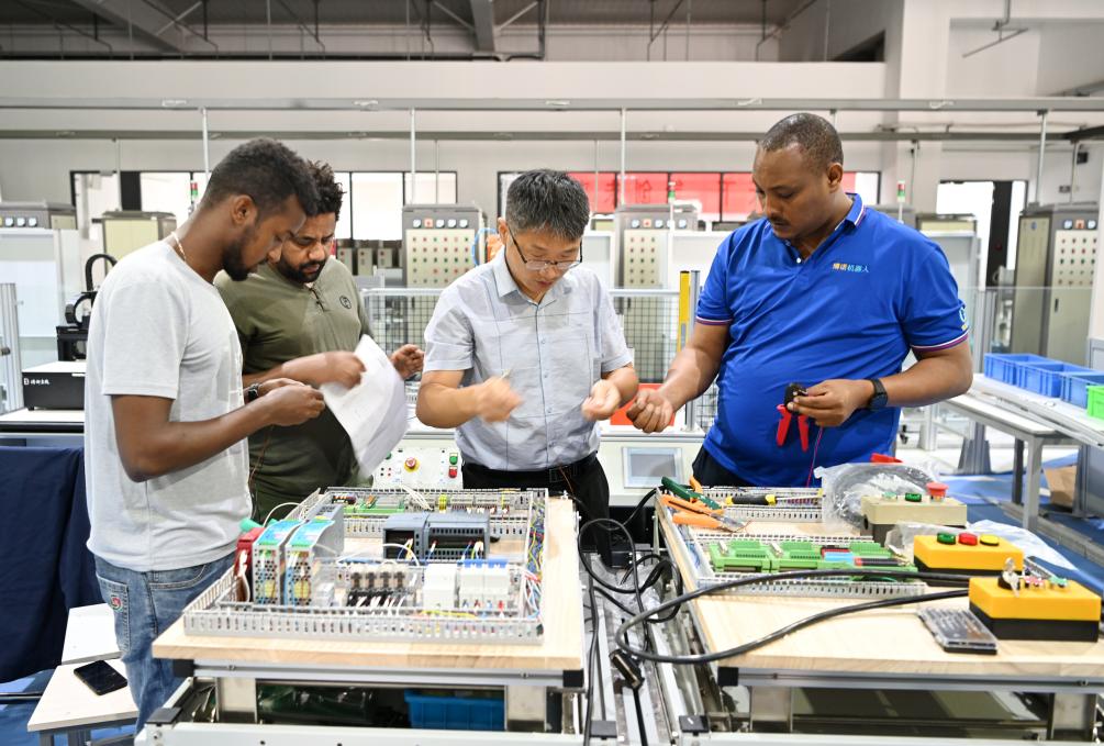 在天津職業(yè)技術(shù)師范大學(xué),老師帶領(lǐng)韓士蘭(右一)和其他留學(xué)生進(jìn)行實(shí)訓(xùn)操作(2022年7月29日攝)。韓士蘭來自埃塞俄比亞,在天津?qū)W習(xí)期間,韓士蘭積極利用學(xué)校先進(jìn)的職業(yè)教育實(shí)踐條件,專注于人工智能制造和工業(yè)機(jī)器人方向的研究。新華社記者李然 攝