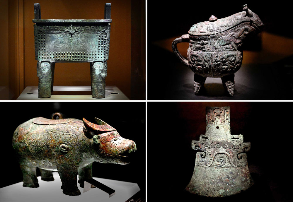 這是2024年2月23日拍攝的河南安陽殷墟博物館新館內(nèi)展出的“司母辛”銅鼎(左上)、“亞長”銅觥(右上)、“亞長”牛尊(左下)、“亞長”銅鉞(拼版照片)。新華社記者 李安攝
