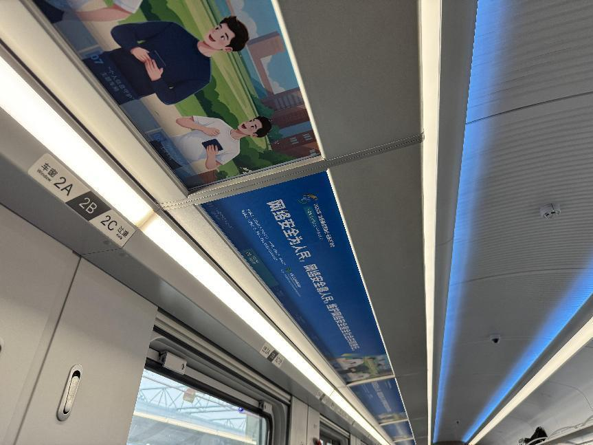 據(jù)介紹,專(zhuān)列的8個(gè)主題車(chē)廂分別以“中國(guó)網(wǎng)絡(luò)法治三十年”“網(wǎng)絡(luò)安全”“數(shù)據(jù)安全”“未成年人網(wǎng)絡(luò)保護(hù)”“數(shù)據(jù)出境之旅”“反網(wǎng)暴凈網(wǎng)行動(dòng)”“個(gè)人信息守護(hù)”以及“網(wǎng)絡(luò)空間命運(yùn)共同體”命名,通過(guò)鏡框海報(bào)、玻璃貼、小桌板貼、行李架彩貼、頭枕片、車(chē)內(nèi)LED信息屏等形式多樣的載體,全面展示網(wǎng)絡(luò)法治30年成就、網(wǎng)絡(luò)空間命運(yùn)共同體主張。讓乘客們?cè)谙硎苁孢m旅途的同時(shí),也能輕松學(xué)習(xí)到實(shí)用的法律信息。