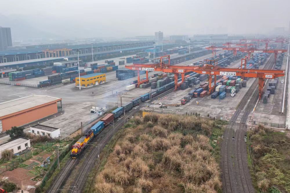 2024年3月7日,一列滿載機械設(shè)備、整車及零部件等貨物的西部陸海新通道鐵海聯(lián)運班列從重慶團結(jié)村中心站駛出(無人機照片)。新華社記者黃偉攝