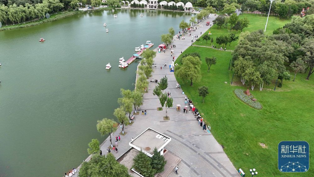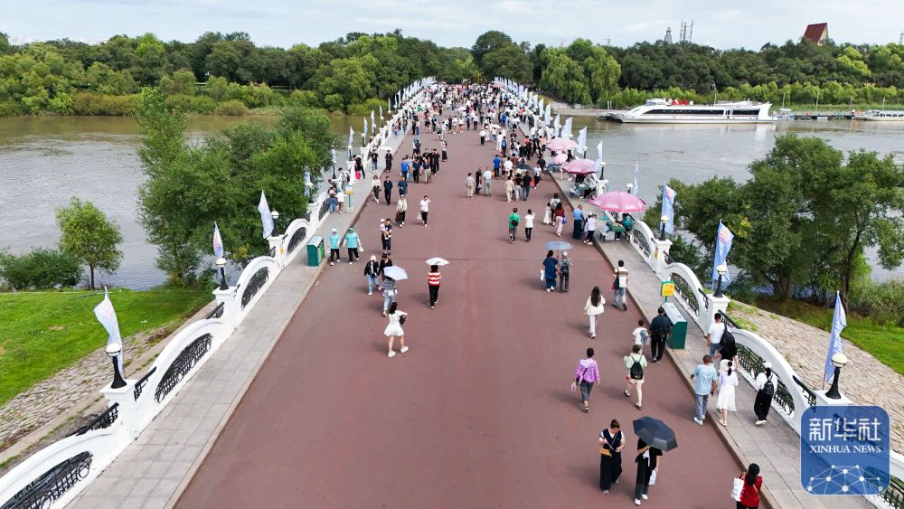 人們?cè)邶埥ぜ瘓F(tuán)綏棱林業(yè)局生態(tài)文化旅游景區(qū)一處公園游覽(7月25日攝,無(wú)人機(jī)照片)。