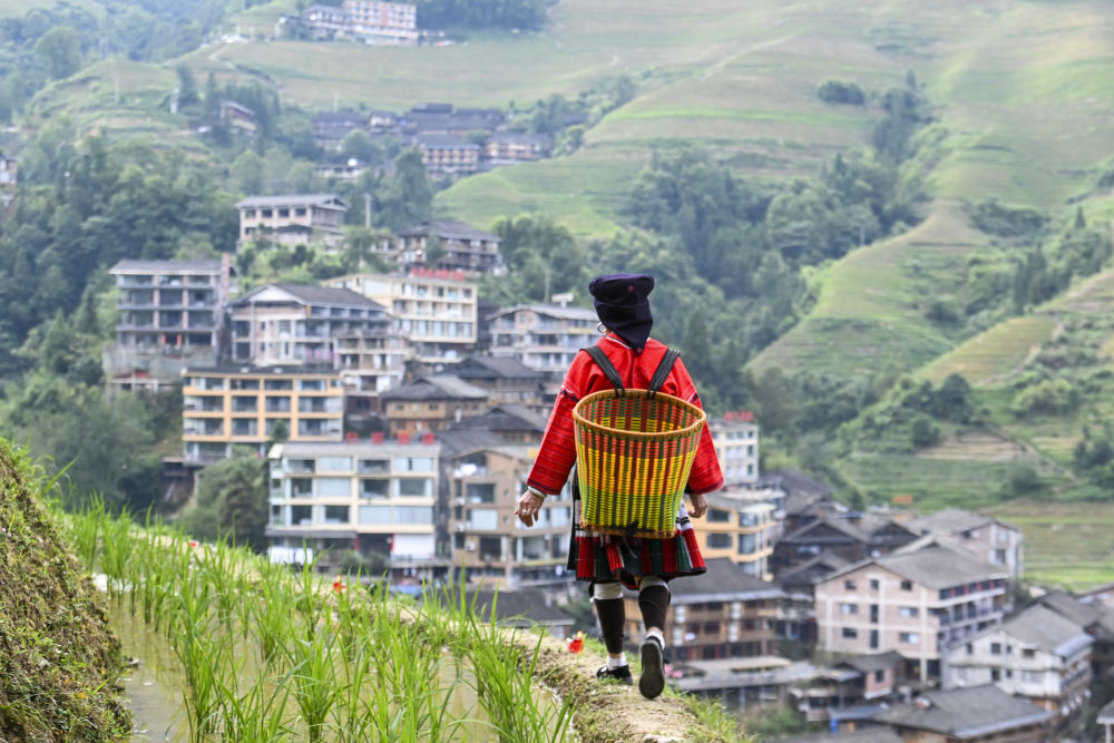 一位瑤族村民行走在大寨村的梯田里。新華社記者曹祎銘 攝