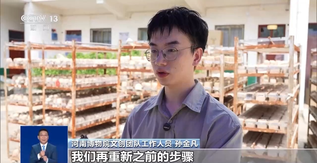 河南博物院文創(chuàng)團(tuán)隊工作人員 孫金凡:和泥巴、調(diào)配方、做試驗,每天都是灰頭土臉的,就是還原文物在考古工作者出土?xí)r的那一瞬間。同學(xué)就會問,還在村里面呢?我說對,還在那和泥巴。