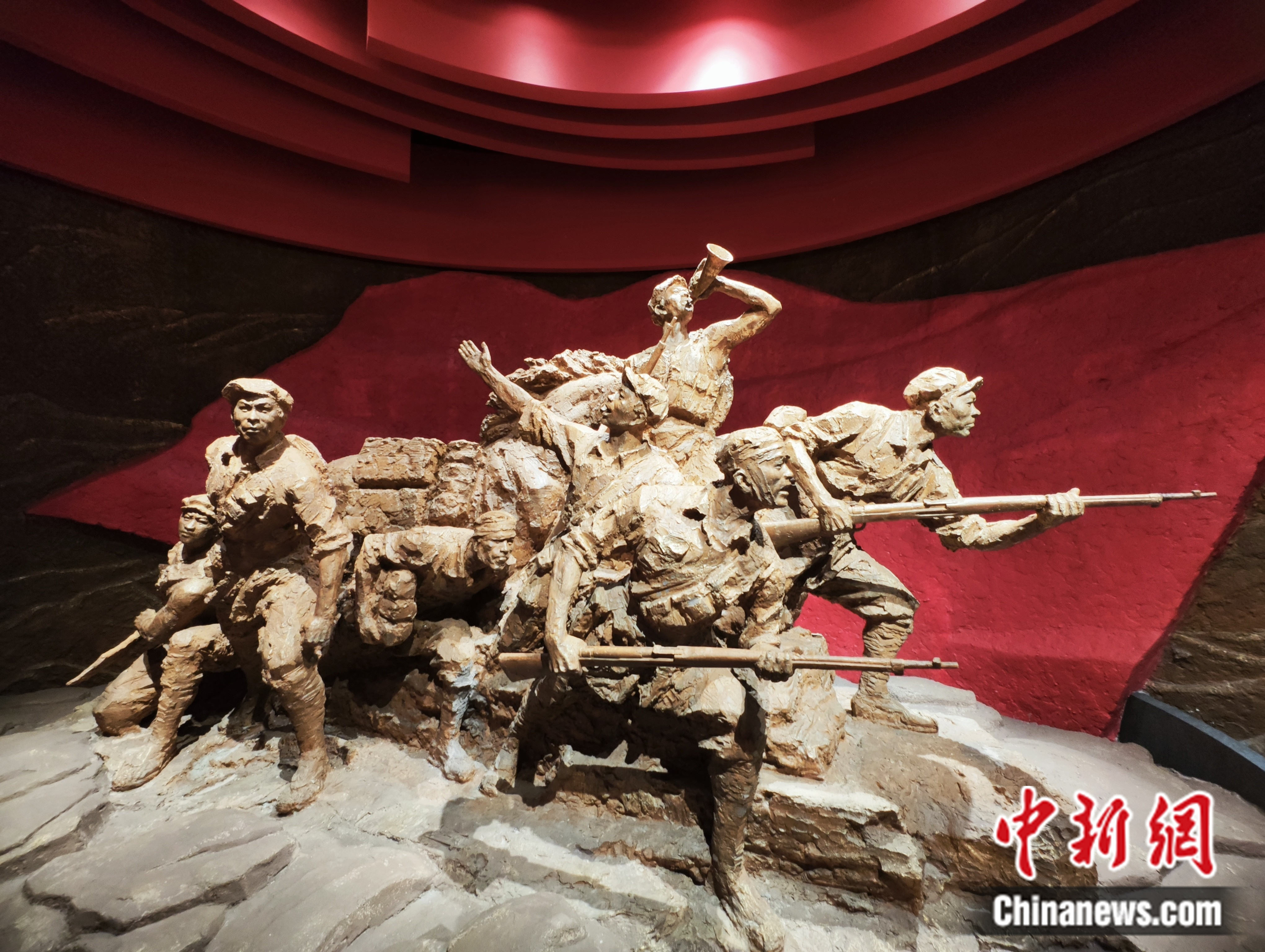 展館正門外,“風展紅旗如畫”的雕塑兩側,十座紅軍司號員雕像映入眼簾,它們高數米,持小號,形態(tài)各異,繪出一幅如火如荼的革命畫卷。