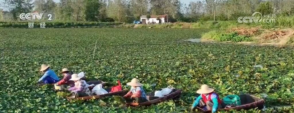 傍晚時分,采菱的村民劃著小船穿梭在碧波綠葉中,從水下扯起一根根菱角藤,采摘綠中帶粉的菱角。不一會兒,船艙就被塞得滿滿當(dāng)當(dāng)。