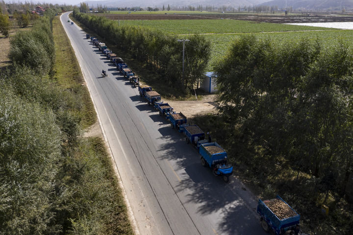 交售馬鈴薯的農(nóng)用車在寧夏固原市西吉縣馬蓮鄉(xiāng)一家淀粉廠門前排起長隊(2020年10月21日攝,無人機照片)。新華社記者 王鵬 攝