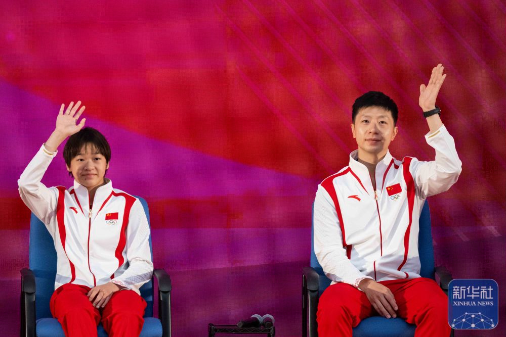 ↑9月1日,跳水運(yùn)動員全紅嬋(左)與乒乓球運(yùn)動員馬龍在活動中揮手致意。