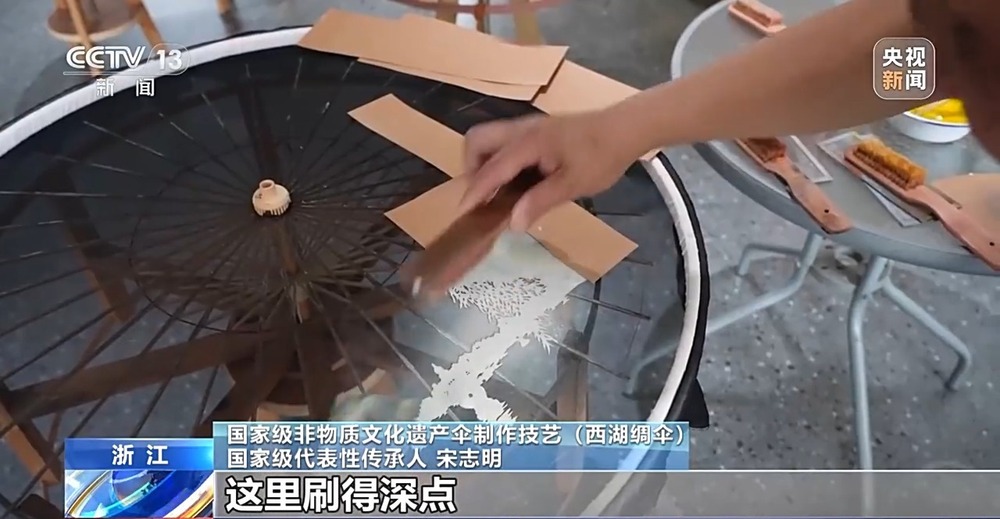 國家級非物質文化遺產傘制作技藝(西湖綢傘)國家級代表性傳承人 宋志明:刷出來的圖案有靈動感,這是其他噴繪、繪畫所出不來的效果,特別是在絲綢傘面上來畫,通過顏料的霧狀,刷花呈現的效果是獨一無二的。