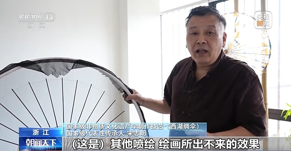 國家級非物質文化遺產傘制作技藝(西湖綢傘)國家級代表性傳承人 宋志明:絲綢是夾在中間的,我們的傘面是夾在中間,所以說收攏你是看不到傘面的,這個是獨一無二的。