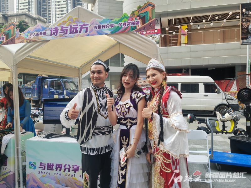 9月2日,“萬人說新疆”走進(jìn)廣東分享會之新疆特色文化主題“大巴扎”在廣州市越秀區(qū)289藝術(shù)創(chuàng)意園區(qū)北廣場舉行。廣州市民陳婕(中)穿著新疆民族服飾與舞蹈演員合影留念。石榴云/新疆日報(bào)記者 甘興華攝