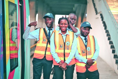 6月12日,在尼日利亞拉各斯,拉各斯輕軌藍(lán)線項目動車組列車司機(jī)組長伊莎貝拉·亞當(dāng)斯·伊斯拉埃爾(中)與同事在站臺上合影。新華社發(fā)