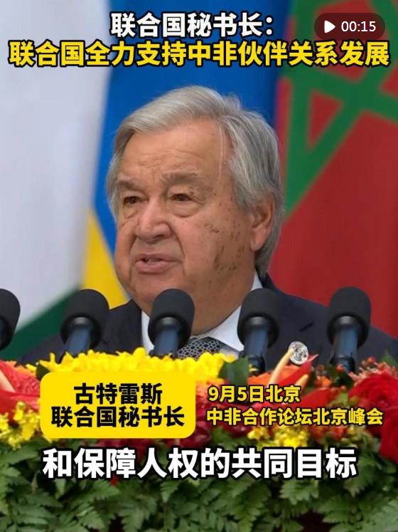 聯(lián)合國(guó)秘書長(zhǎng)古特雷斯5日在中非合作論壇北京峰會(huì)開(kāi)幕式上說(shuō),聯(lián)合國(guó)將全力參與支持中非發(fā)展堅(jiān)固的伙伴關(guān)系,推動(dòng)世界實(shí)現(xiàn)和平、可持續(xù)發(fā)展和保障人權(quán)的共同目標(biāo)。