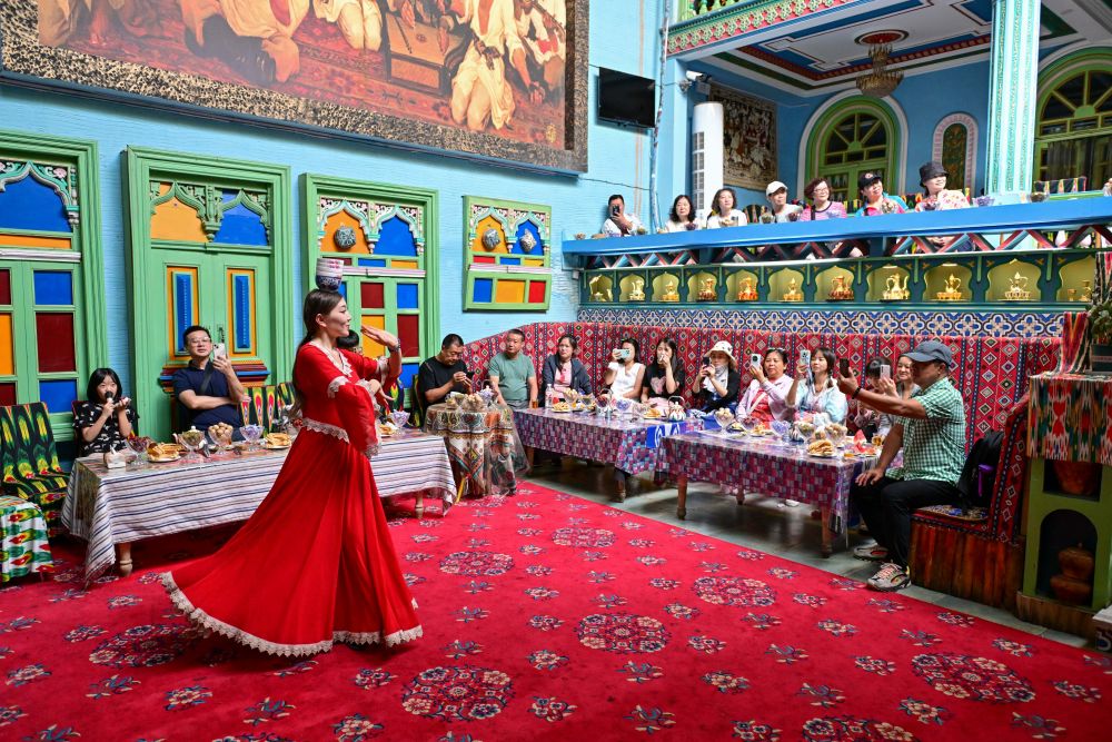 在新疆喀什古城景區(qū),游客在“古麗的家”民宿內欣賞文藝表演。新華社記者 丁磊 攝